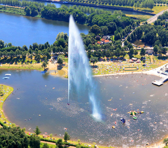 Heb jij onze reuzenfontein al gezien? Op warme zomerdagen is deze spectaculaire reuzenfontein dé blikvanger van het Midden-Limburgse Maasplassengebied en met zijn maximale spuithoogte van maar liefst 120 meter één van de allerhoogste fonteinen van Europa! Wist je dat het water maar liefst met 250 kilometer per uur de lucht in spuit?
